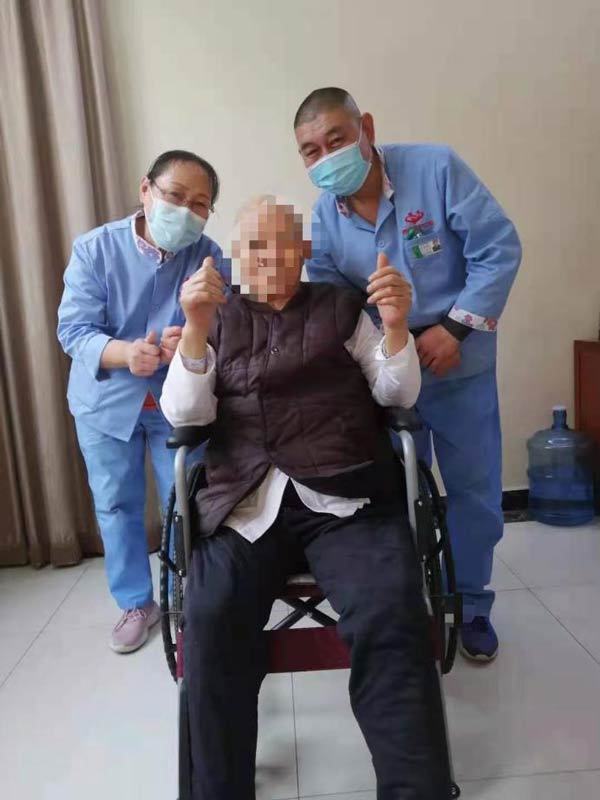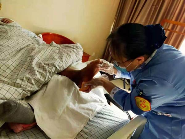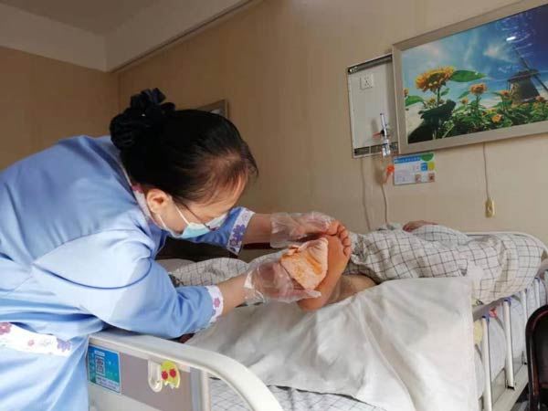 治疗期间,护士针对è€äººçš„特殊情况对护ç†å‘˜è¿›è¡Œç›¸å…³ç…§æŠ¤çŸ¥è¯†åŸ¹è®ä¸Žå¦ä¹ ,贾阿姨一一记在心里,一方é¢åšå¥½è€äººç³–尿病足的针对性照护——æ¯å¤©ä»”仔细细检查è€äººçš®è‚¤ï¼Œå°¤å…¶æ˜¯è¶³è¶¾é—´ã€è¶³åº•ï¼Œä¸€ç‚¹å„¿åœ°æ–¹éƒ½ä¸æ”¾è¿‡ï¼›ç”±äºŽæ´—脚水温ä¸èƒ½è¿‡é«˜ï¼Œæ¯å¤©æ´—脚å‰ï¼Œå¥¹éƒ½åœ¨å‰è‡‚内侧试过没问题åŽå†ä¸ºè€äººæ´—脚,最åŽç”¨å¹²æŠ¹å¸ƒè½»è½»æ“¦å¹²ï¼Œè¶³è¶¾é—´æ¯æ¬¡éƒ½æ“¦çš„干干净净;è€äººè¦æ³¨æ„ä¿æ¸©ï¼Œå¥¹ç‰¹æ„挑选棉袜,把袜å£å‰ªæ¾ï¼Œå¢žåŠ è€äººèˆ’适度;测糖谱也是æ¯å¤©éƒ½è¦è¿›è¡Œçš„工作,贾阿姨特æ„将监测时间贴在墙上,按点æé†’护ç†äººå‘˜....... å¦ä¸€æ–¹é¢ï¼Œåƒå®¶äººèˆ¬ç…§é¡¾ç€è€äººçš„饮食起居ã€å¥åº·ç…§æŠ¤ã€å¿ƒç†æŠšæ…°ï¼Œè€äººå–œæ¬¢å–茶,贾阿姨æ¯å¤©ä¸‹åˆä¸ºè€äººæ³¡ä¸€å£¶èŒ¶ï¼Œå’Œè€äººæ™’ç€å¤ªé˜³èŠå¤©è§£é—·å„¿ã€‚å°½èŒå°½è´£ã€äº‹æ— å·¨ç»†çš„ç…§æ–™ï¼Œæ¢æ¥çš„æ˜¯ä¸€ç‚¹ä¸€ç‚¹çš„笑容与好转,è€äººçš„åˆ›é¢æ—¥æ¸ç¼©å°ï¼Œè„¸ä¸Šçš„笑容也越å‘多了起æ¥ï¼Œå®¶å±žæ›´æ˜¯è¿žè¿žæ„Ÿè°¢ï¼