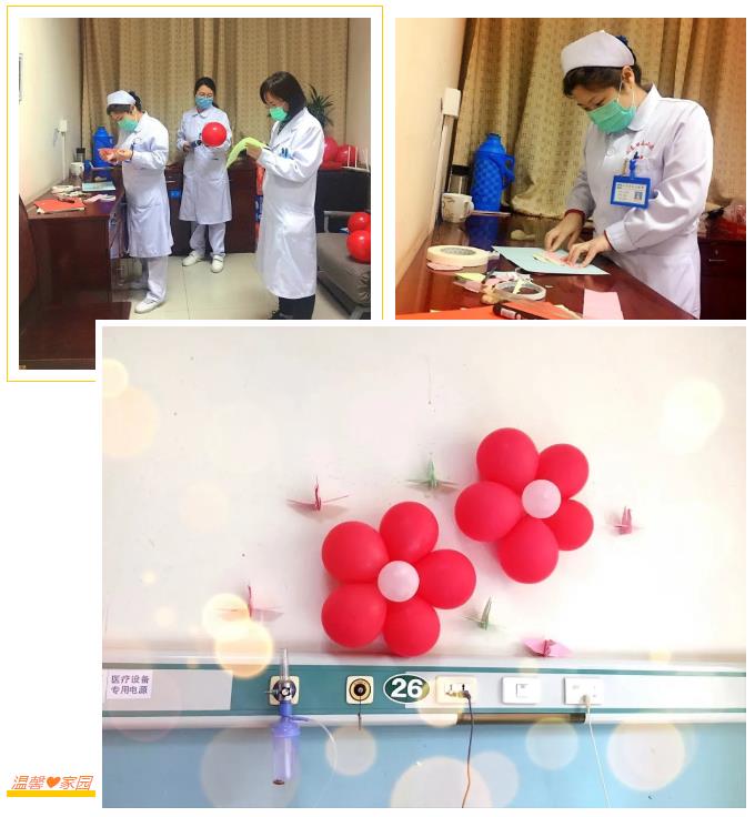 由于抗击疫情,医院病区实行封闭管理,王爷爷的儿女们无法到病房陪伴,如何才能让老人度过一个温暖的生日,我们还真下了一番功夫。大家集思广益、统筹规划,内外协调。花朵没有,我们自己折;贺卡没有,我们自己做;原材料没有,我们想办法借。郑文护士长带领封闭区外的护理姐妹帮我们从疗养接待中心借来了彩纸,从养生养老中心借来了气球。材料有了,大家不顾一天的疲惫,合理分工,开始制作。我们用纸折出了美丽的花朵、祝福的千纸鹤与精美的贺卡,吹出了彩色的气球,当所有的工作准备完毕已近子夜,我们终于能安心地休息了。