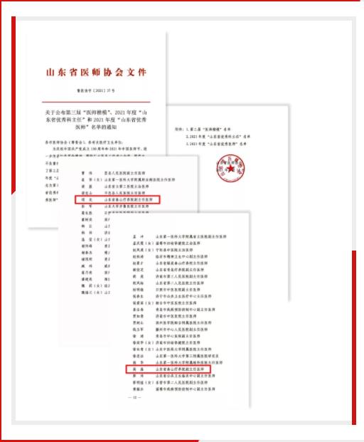 为庆祝中国共产党成立100周年和2021年中国医师节,进一步传承红色革命精神,激励广大医务工作者心向党、跟党走,不负重托、恪尽职守,忠诚守护人民群众健康,山东省医师协会开展了第三届“医师楷模”、2021年度“山东省优秀科主任”和2021年度“山东省优秀医师”推荐评议工作。山东省泰山医院(山东省泰山疗养院)续龙、高磊荣获“山东省优秀医师”称号。