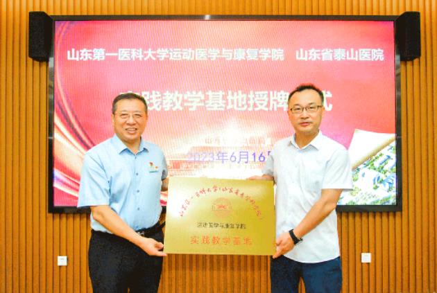 6月16日下午,山东省泰山医院、山东第一医科大学运动医学与康复学院实践教学基地签约授牌仪式隆重举行。山东省泰山医院党委书记毛军胜、党委副书记贺伟,山东第一医科大学运动医学与康复学院院长贾庆卫、副院长纪龙,以及双方部分相关科室负责人出席了此次签约仪式。签约仪式由贺伟主持。