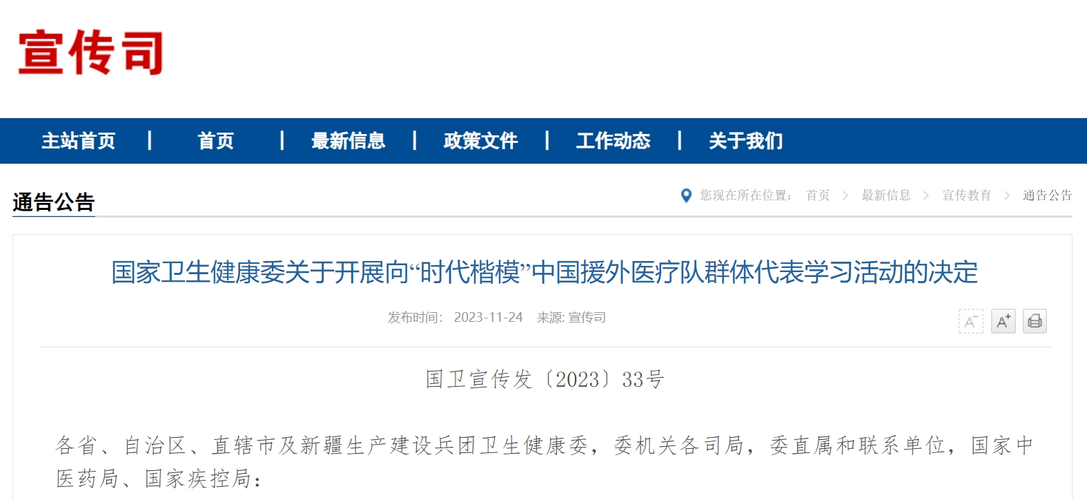 国家卫生健康委关于开展向“时代楷模”中国援外医疗队群体代表学习活动的决定